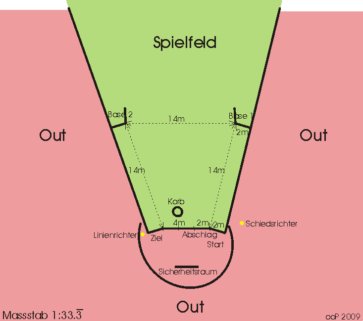 Berührt der Ball den Boden erst ausserhalb des Feldes, gilt er als „out“ und der Durchgang ist beendet. Alle Läufer gehen zur Ausgangsposition zurück und der Spieler, welcher den Ball geschlagen hat, begibt sich zum Start. Wird der Ball aber vorgängig von einem Fänger berührt (innerhalb oder ausserhalb des Feldes), so gilt er nicht als „out“ und der Durchgang geht weiter.